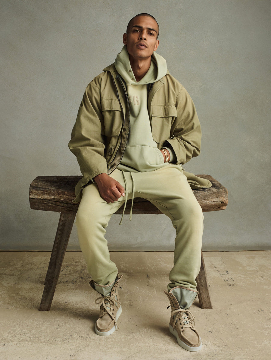 The FG hoodie is hand crafted with a sun fade wash process and antique brass hardware to create a unique vintage piece that will vary in appearance. The FG logo on the front and Fear of God logo on the back are stenciled in textured velvet flocking, which are inspired by vintage American military sweats!
